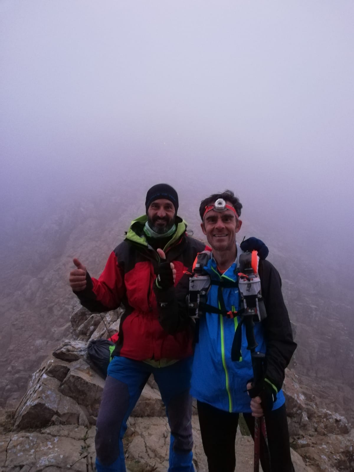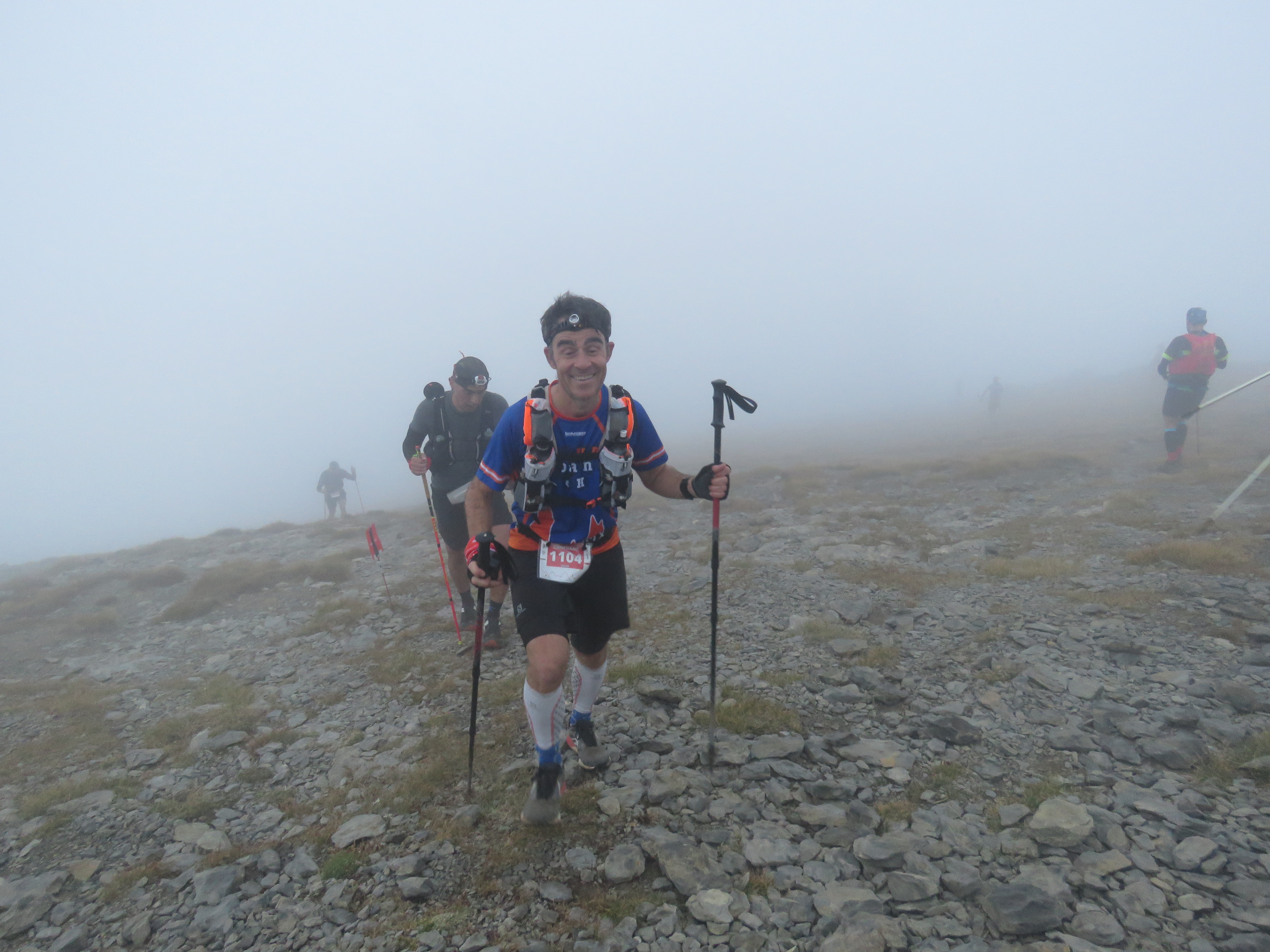 Ya en el collado, se sigue la ruta que sube desde Aisa. Estaba sentado un corredor. Le pregunté si todo bien y me dijo que no hablaba castellano, sino francés. En francés le comenté algo. Pero no estaba muy hablador o mi francés es muy malo. Era de la 100k y estaría cansadete. Se me hizo larga la subida bordeando la ante cima oeste, hasta llegar al collado del Tubo, bajo la cima. La niebla iba y venía, pero no era espesa, aún era de día y se veía bien Al llegar, un voluntario exclamó: “¡Carlos, un Andandaeh, este es de los tuyos! Ahí estaba mi compañero y amigo Carl. Le saludé efusivamente. Las ganas que tenía de verle, porque sabía que estaba en ese punto. Nos hicimos una foto y tiré hacia la cima. Ya quedaba poco. Al llegar me vitorearon los voluntarios, pero porque con mi llegada se había abierto la niebla. Llegué a las 20h 33’, tras 14h. y media de carrera, y sólo 24 minutos más tarde que Alejandro. Y sobre todo, de día.