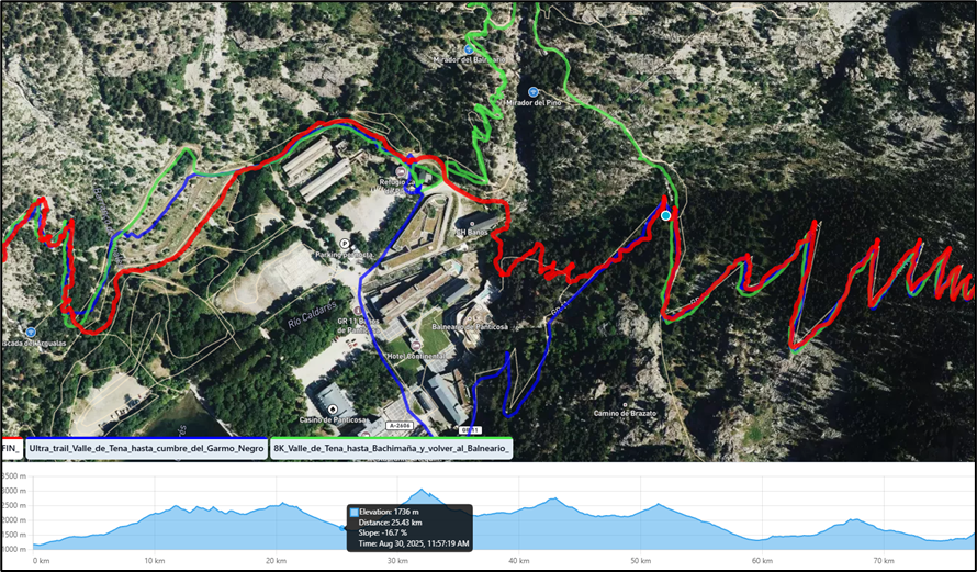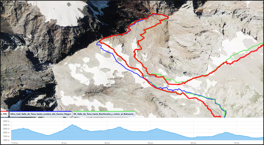 Subida y posterior bajada del Garmo Negro, comparativa de los tres años (rojo en 2025, azul en 2018 y verde en 2019).