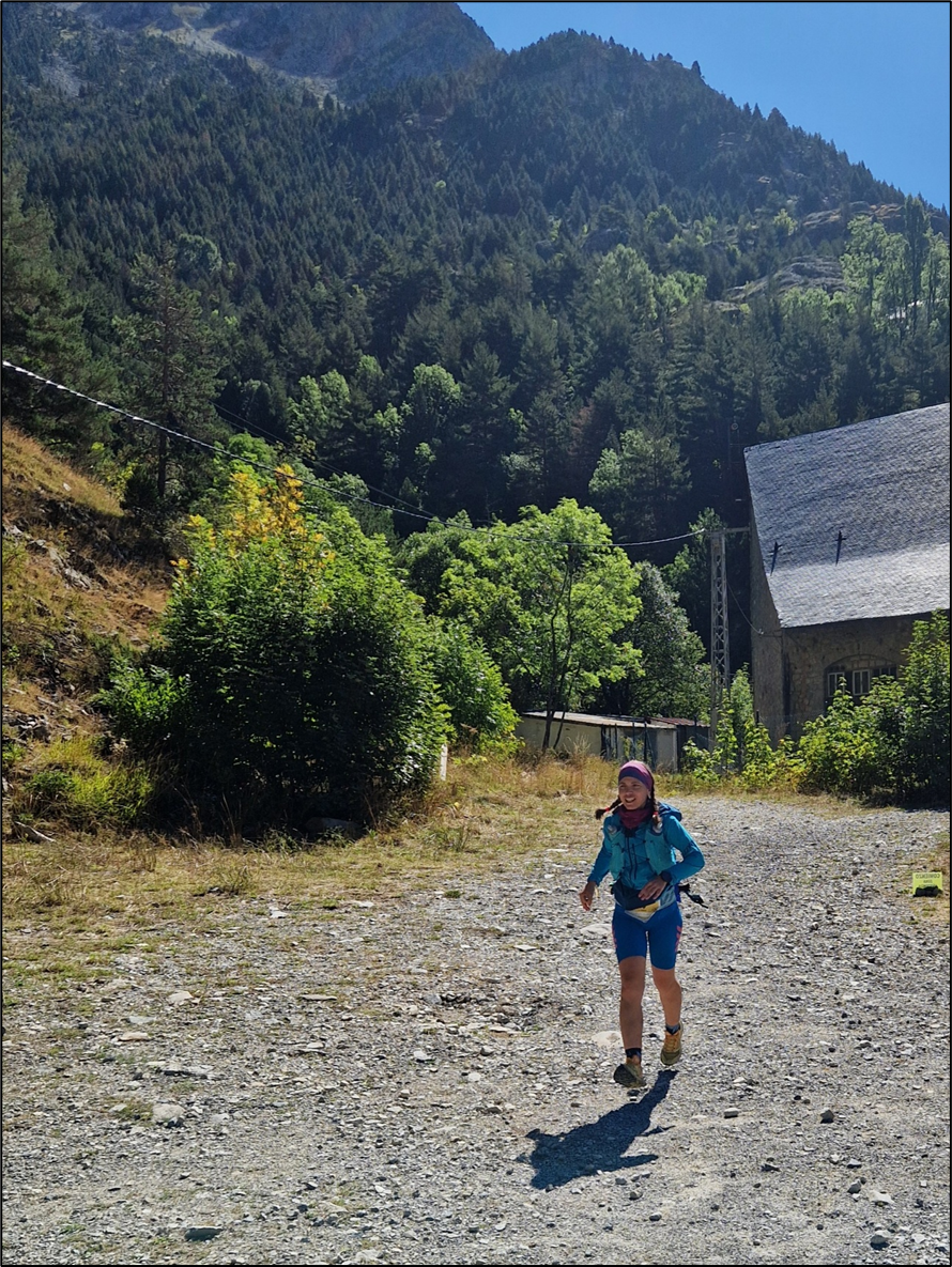 El sendero tarda en mejorar y nunca ves el momento de llegar al refugio. Yo ya estaba curada de espanto por las otras dos veces. Tramos buenos, tramos malos, tramos peores, algún pedrolo, más pedrolos, un cacho de césped, así casi hasta llegar al refugio. Dejé pasar a una corredora que iba mejor que yo, y ya pronto alcancé la última subida, estaba ahí mismo el avituallamiento. Comencé a caminar por la pasarela de conexión, y cuando vi a lo lejos a Toñi, mi voluntaria favorita de Bachimaña (y Ángel Orús), comencé a chillar de alegría “Toñiiii, esta vez sí que sí”. Y me puse a correr como si no hubiera un mañana.