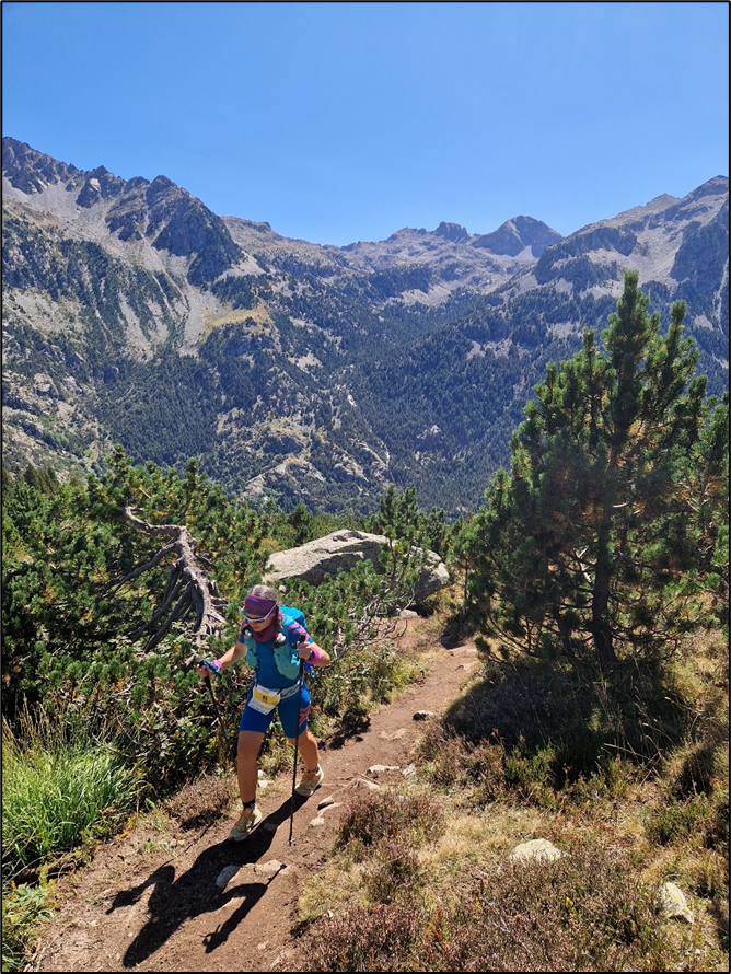 Sabía que ahora venía la parte mala del recorrido que conocía (“una de las partes más técnicas”, dice la descripción, y razón no le falta). Esta vez, después de ya unas cuantas carreras, y algo más de experiencia, sobre todo por los pedrolos de Salenques, pude moverme algo mejor por los bloques enormes de granito que recordaba perfectamente. Siempre se me había hecho bola, pero, sorprendentemente, a lo que me quise dar cuenta, ya estaba enfrentando el camino de bajada. En esa parte de la carrera coincidí con un corredor al que ya había visto en grupeta en el Gran Trail del Aneto del 2021, me dijo que no pudo terminarla.