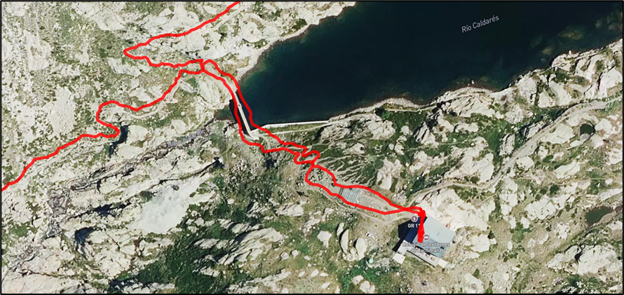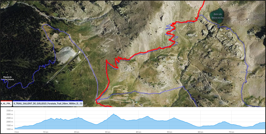 En rojo, ultra de Tena, y en azul, recorrido del Trail Sallent de Gállego, que hacía un buble, pasaba por el ibón, y volvía a bajar.