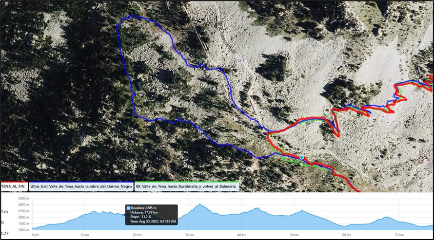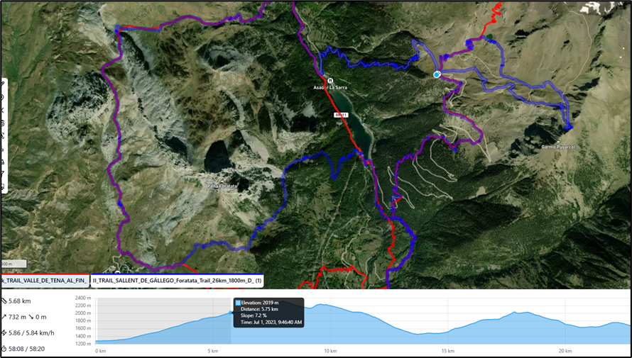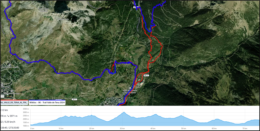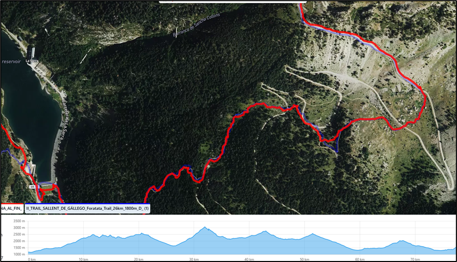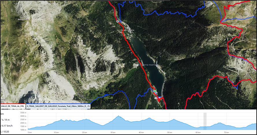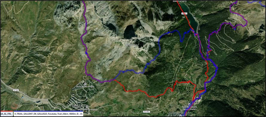 En azul, track de la Foratata Trail, y en rojo, track de la ultra de Tena.