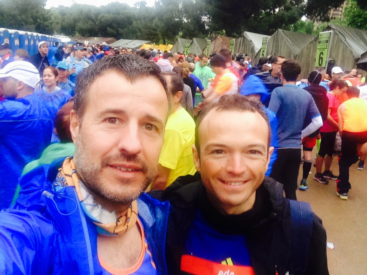 Y salió… lluvioso. Quedamos a las 8:00 para dejar la bolsa con ropa para cuando finalizáramos la carrera (bolsa que me salvaría la vida). A las 8:30 nos encontramos con Gorka, el otro representante de Andandaeh que iba a correr. Está más fuerte que el vinagre, y su intención era terminar en menos de 3h10. Fotos, saltitos, risas… y al cajón de salida. 3….2…1…. Go!