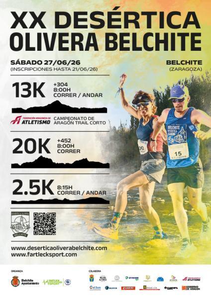 El próximo sábado 27 de junio se celebrará en Belchite la XX edición de la Desértica Olivera Belchite, organizado por el Ayuntamiento de Belchite y bajo la dirección técnica de Fartleck Sport. La prueba está incluida en el calendario autonómico bajo el control técnico del Comité Territorial de Jueces FAA y se realiza sobre una distancia de 2.5K, 13K y 20K no homologadas por la RFEA FECHA: 27/06/2026
